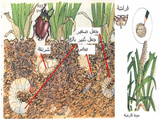 1- حشرات تعيش تحت سطح التربة: وتتغذى الحشرة الكاملة او اليرقات على جذور النباتات، وتظهر اعراض الاصابة بعد ان يقع الضرر للمسطح على شكل مناطق جافة جرداء ميته.